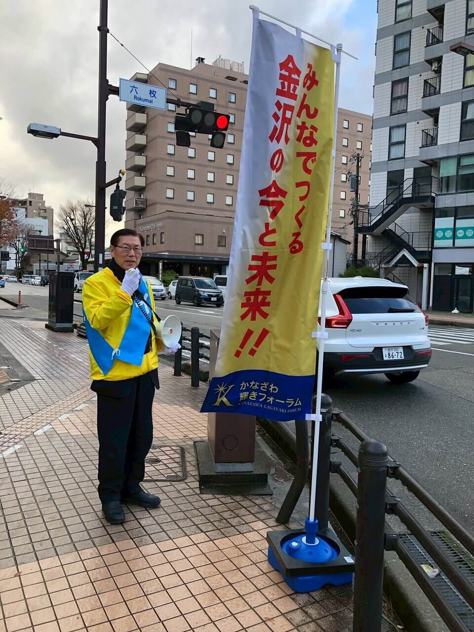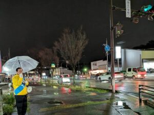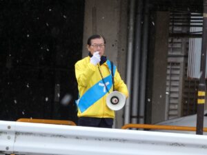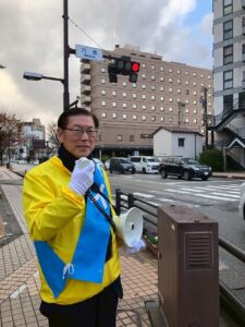 交通量は多く、声は届かなくとも、黄色ののぼりと、ウィンドブレーカーの存在感が少しでも伝わっていれば、という思いで立ちました。